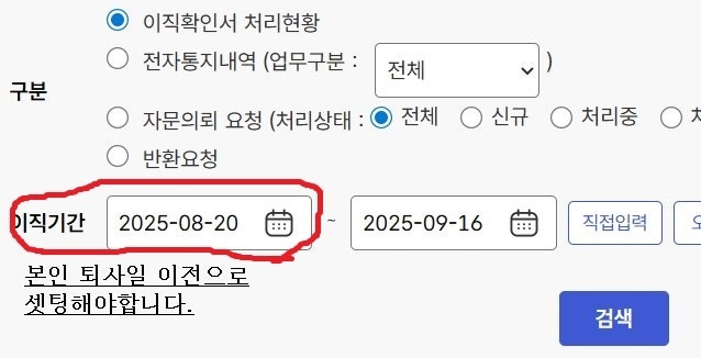 아래 조회날짜를 전직장 퇴사일전으로 셋팅해보세요~